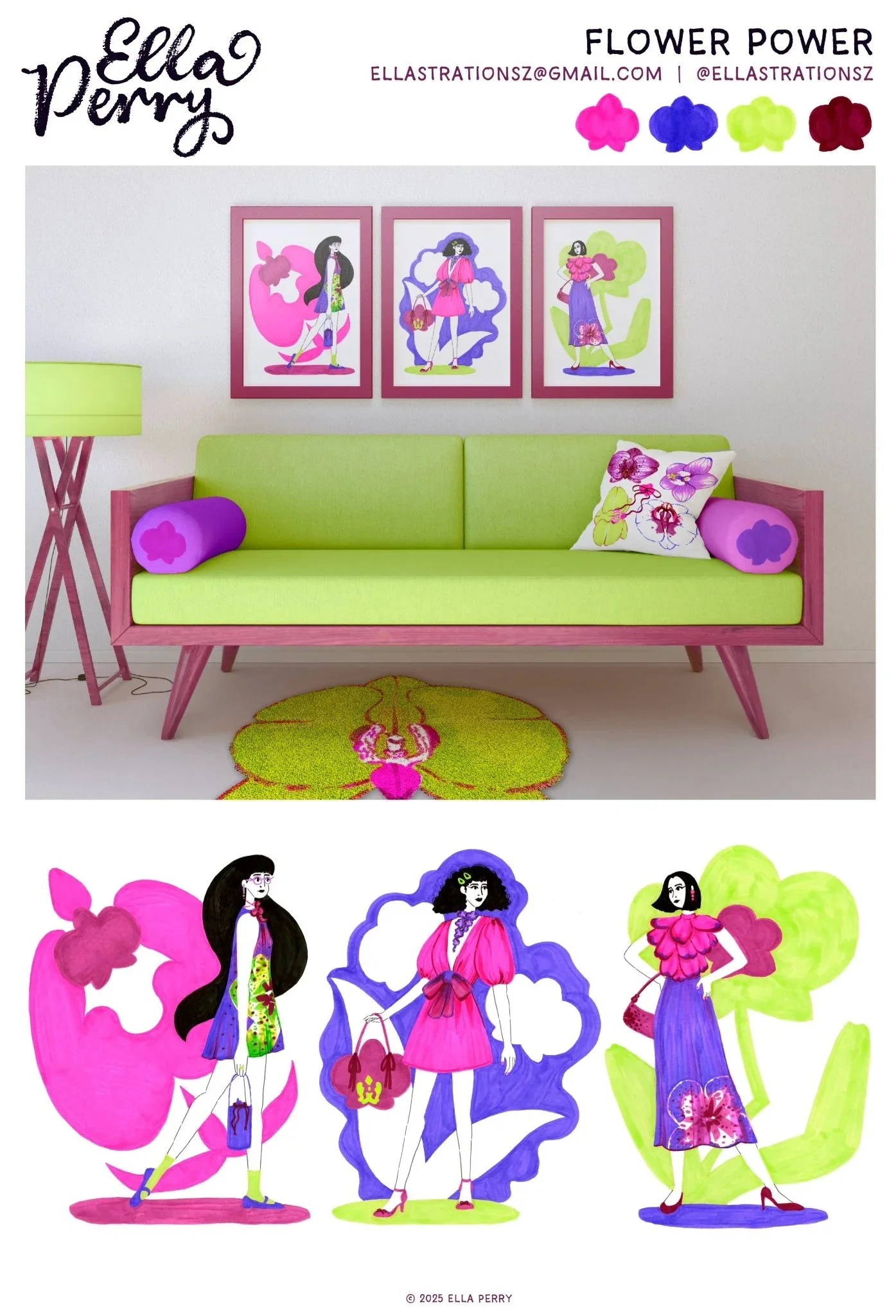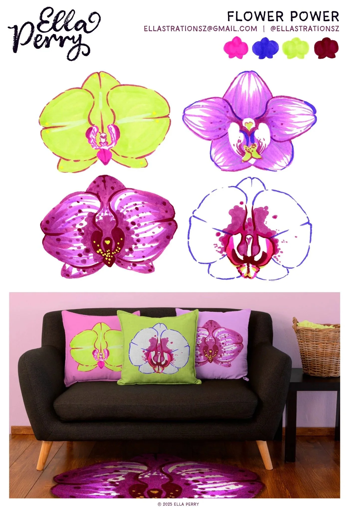 My love for fashion illustration guided this collection! Inspired by the popularity of orchid motifs, I researched their appearances in the fashion world before translating my findings into decorative illustrations for wall art, pillows, and rugs.