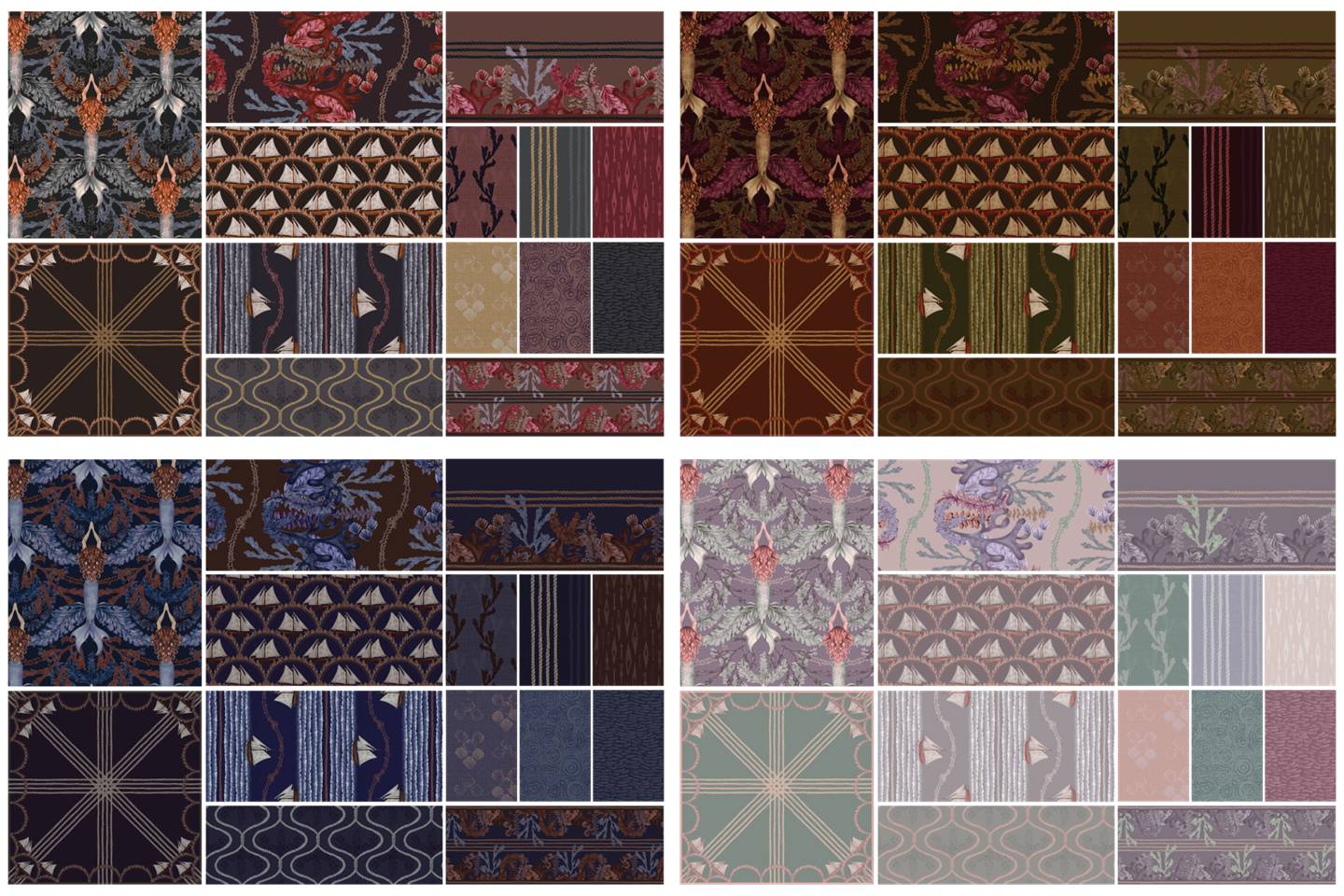 Pulling inspiration from many trends, this collection recognizes and expands upon a few common threads to reflect the inner world of its audience – triumphs of imperfection and craftsmanship, the ocean as a setting for self-exploration, the urge to rebel in uncertain times, and storytelling as a driving force. This particular tale of reinvention follows a maiden tethered to a ship whose path she didn’t choose, and how she transforms after the realization that one strike of a match can change everything. Through traditionally illustrated motifs, the tension between growth and stagnation plays out on the fabric as rope and ocean plants intertwine. Intended for timeless, high-quality garments, these prints will accompany the wearer through multiple stages of life until, like folklore, they are passed down to the next generation of women writing their own stories.